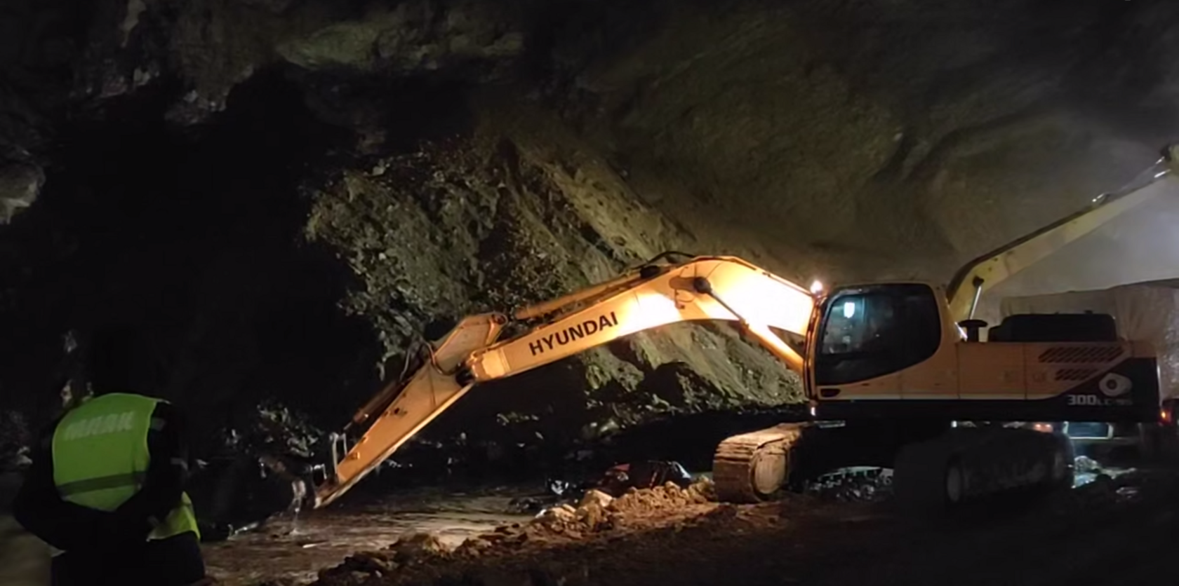 Задействованы тяжелые гусеничные экскаваторы, которые собирают нефтепродукты с поверхности воды и загружают их в специально подготовленные самосвалы.